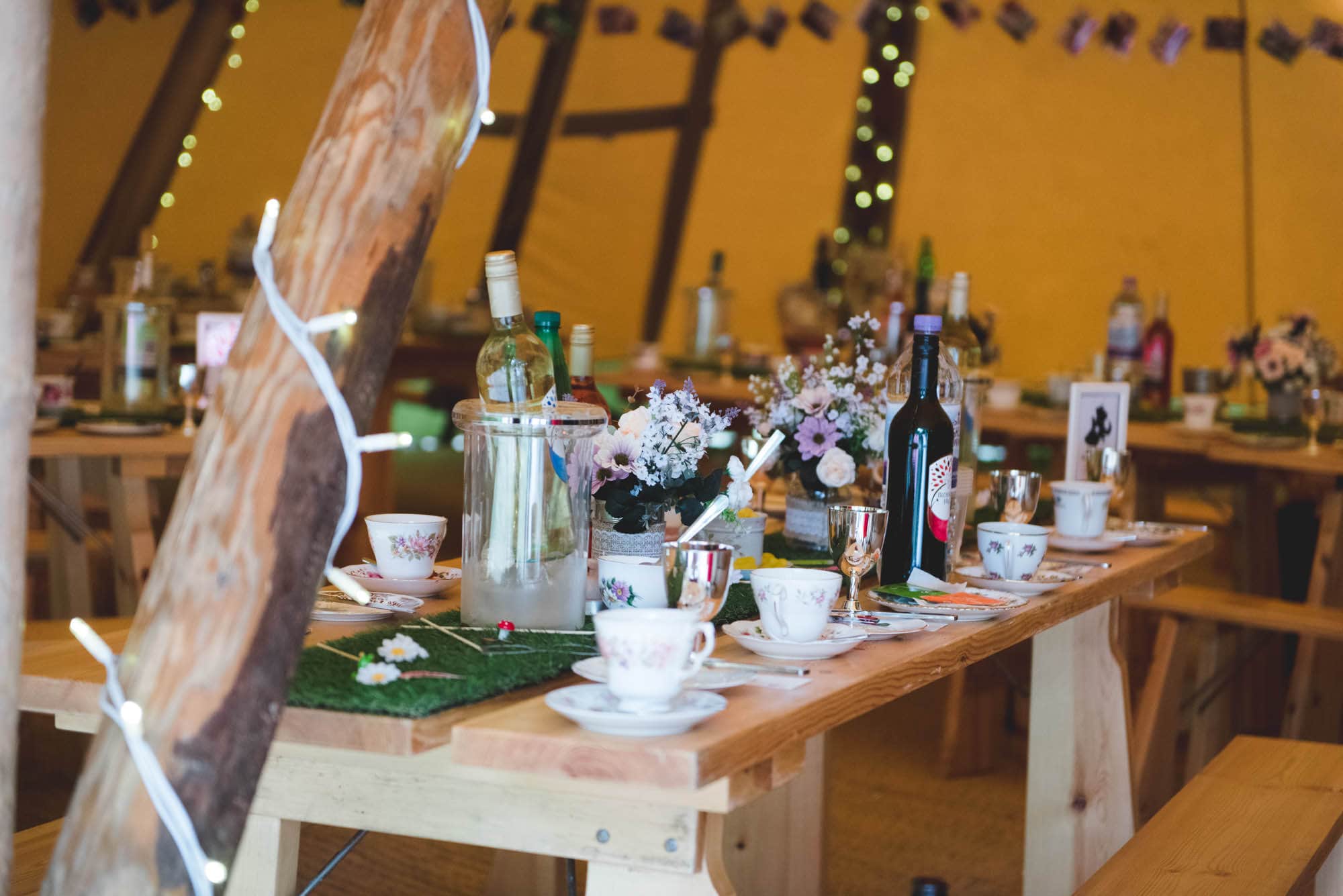 Umberslade Adventure calls itself ‘Enchanting Woodland Weddings’ for days like this, and you can see why. It feels quite magical as you walk through the carved wooden entrance and make your way along woodchip pathways until you reach a clearing. The first thing to catch the eye was the twin hats of the tipi, reaching up to the sky, shade in the sun or protection in the rain.